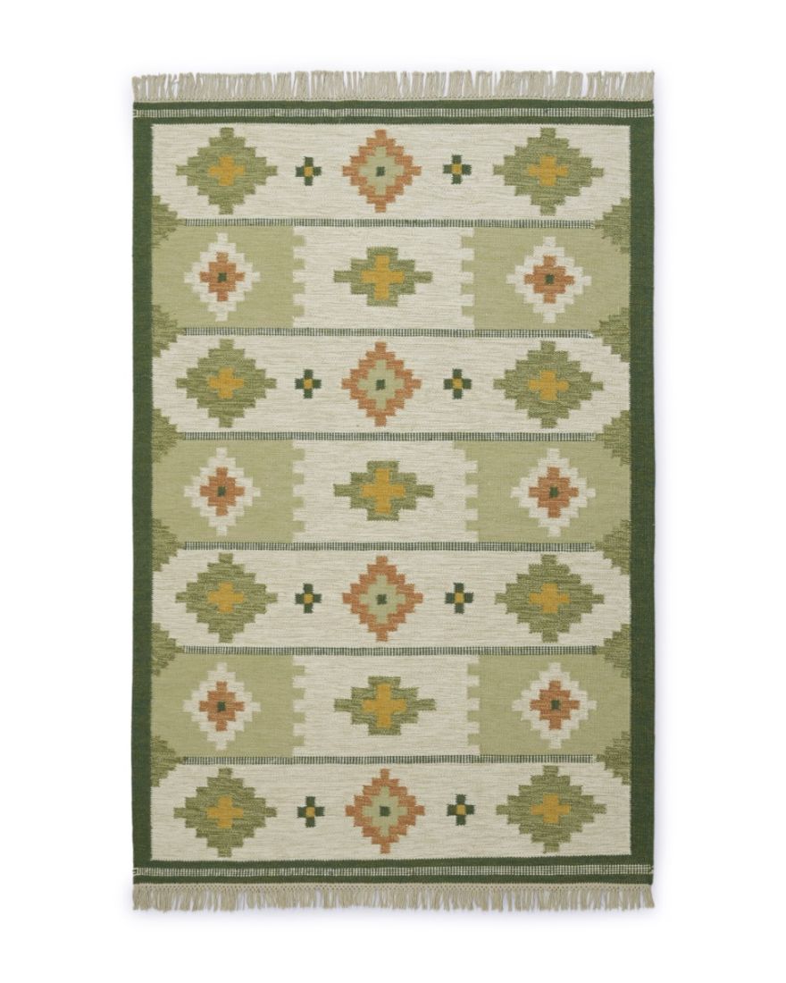 Arholma er et håndvævet uldtæppe med et traditionelt mønster i flotte farver. Et tæppe med denne type mønster og farver kaldes et klassisk röllakan-tæppe. Tæppets korte sider afsluttes med en lys frynse. Her ses Arholma i farven grøn.