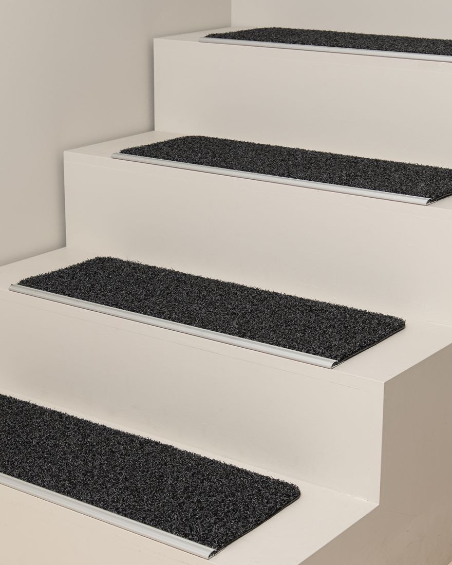 Mega Scrape er en trappetrinsmåtte, der er tilpasset både indendørs og udendørs brug. Trappetrinsmåtten kan anvendes til at modvirke skred på glatte stentrapper eller til at skrabe snavs og grus væk fra sko på trapper i forbindelse med entréer. Denne variant af Mega Scrape afsluttes med en lige aluminiumsliste, hvilket gør trappetrinsmåtten velegnet til eksempelvis trapper med en ujævn struktur, eller dér hvor en nedadgående kant ikke er en mulighed. På overfladen er der små dræningshuller. Trappetrinsmåtten fastgøres nemt ved hjælp af dobbeltklæbende tape på forkanten, alternativt kan tæppet skrues fast i underlaget. Her ses Mega Scrape i varianten antracit steel.