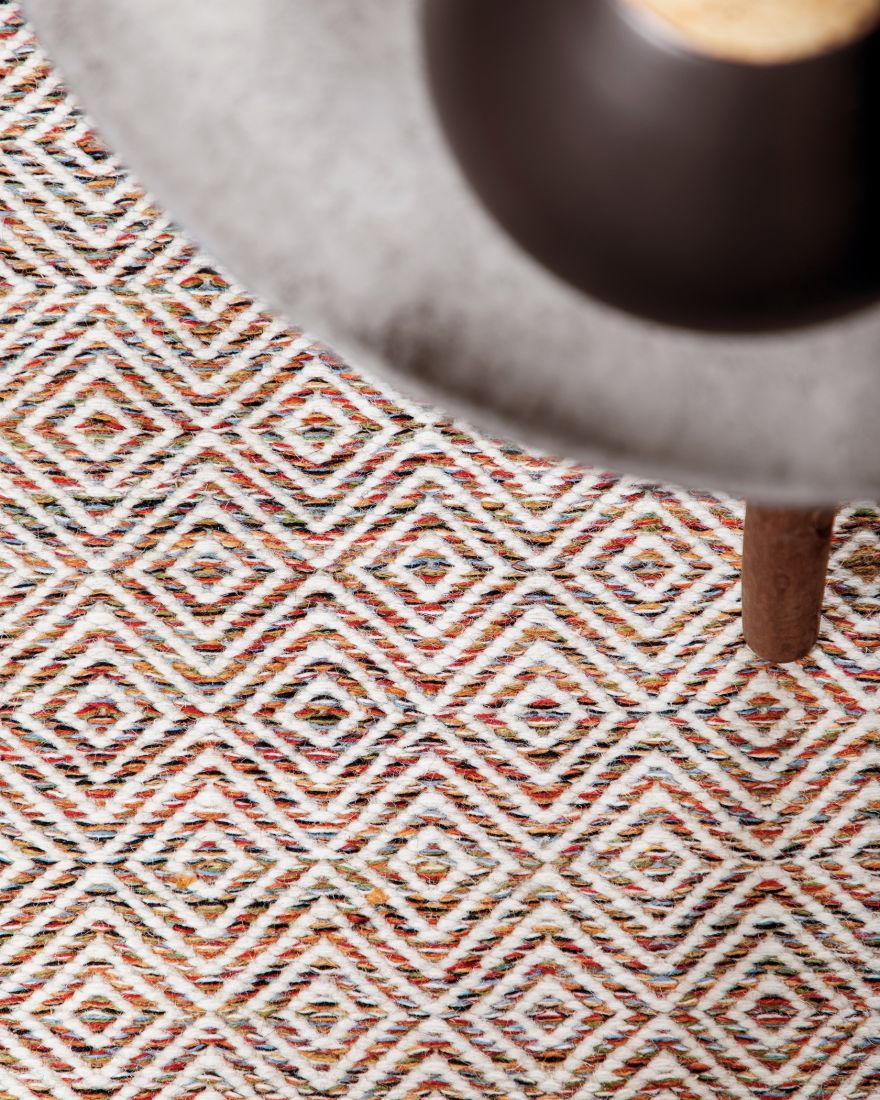 Orissa er et fint håndvævet uldtæppe med et klassisk gåseøjemønster. Her ser du Orissa i farven multi.