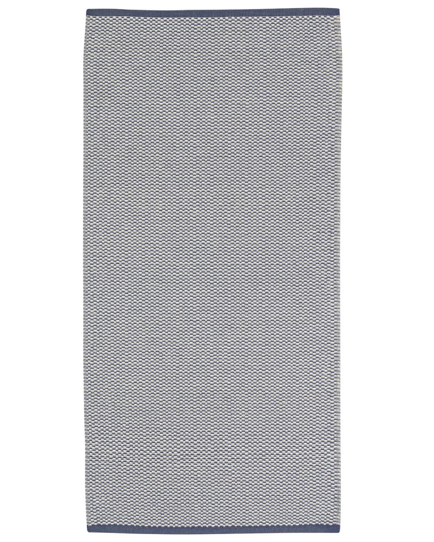 Orust er et uldtæppe fra den svenske producent Horredsmattan. Det har et let meleret mønster i forskellige nuancer med en ensfarvet kant. Her ser du Orust i farven blå.
