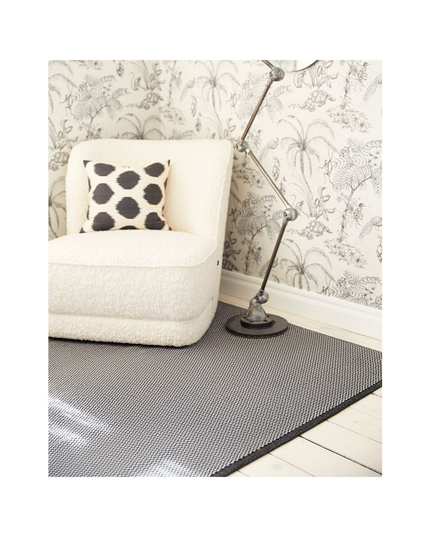 Orust er et uldtæppe fra den svenske producent Horredsmattan. Det har et let meleret mønster i forskellige nuancer med en ensfarvet kant. Her ser du Orust i farven grafit.
