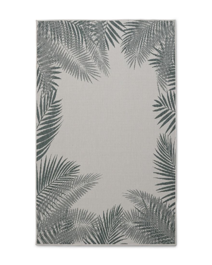 Palma er et fladvævet, vendbart tæppe, der kan lægges med begge sider opad. Tæppet tåler fugt og kan derfor placeres både indendørs og udendørs. Det er dekoreret med flotte palmeblade og giver en skøn følelse i rummet. Her ses Palma i farven grøn.