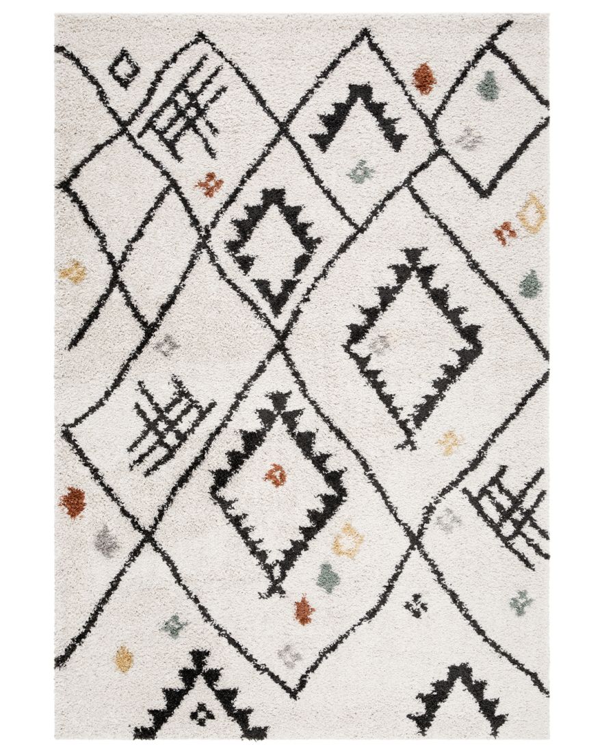 Portland er et maskinvævet ryatæppe med en længere skåret luv. Kilim-mønsteret i en mørk antracitgrå tone pryder den cremehvide bundfarve, hvor der også er små detaljer i farver som terrakotta, gul og grøn. Tæppets bløde garn har en let glans, der giver det et elegant udtryk, samtidig med at det er rart at hvile fødderne på overfladen. Her ses Portland i farven Kilim hvid.