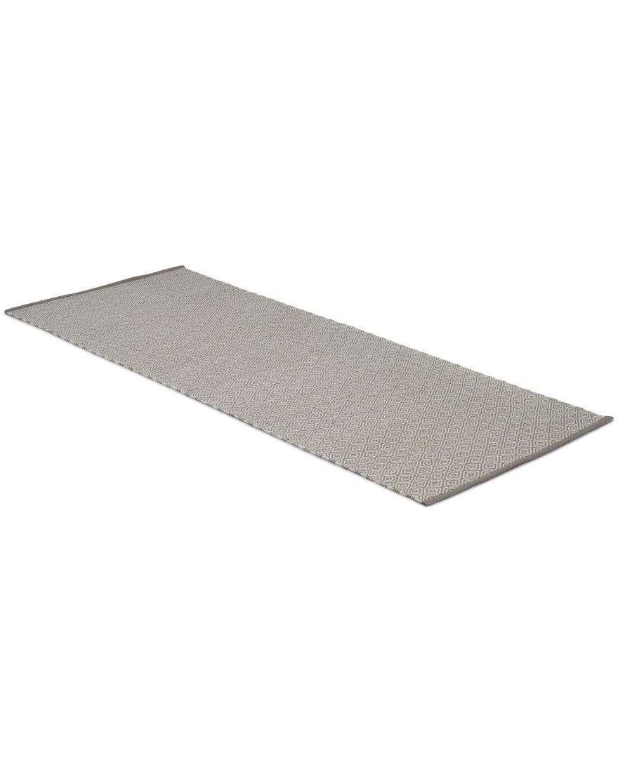 Rättvik er et håndvævet tæppe som er vævet af genbrugte pet-flasker. Tæppet har et klassisk gåseøjemønster. Her ser du Rättvik i farven grå.