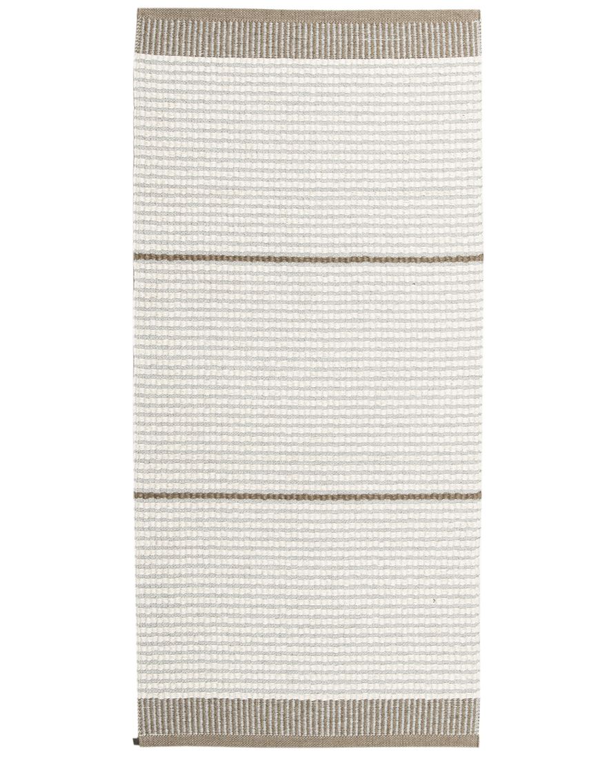 Rosa sand er et plasttæppe fra svenske Horredsmattan, hvis produkter står for høj kvalitet og en lang levetid. Tæppet er vævet i et stribet mønster, hvor en karakteristisk farvet linje regelmæssigt bryder som en kontrast. Samme farve afslutter elegant de korte sider. Plasttæpper er praktiske og passer i såvel køkkenet som i vaskerummet. Her ses Rosa i den beige farve sand.