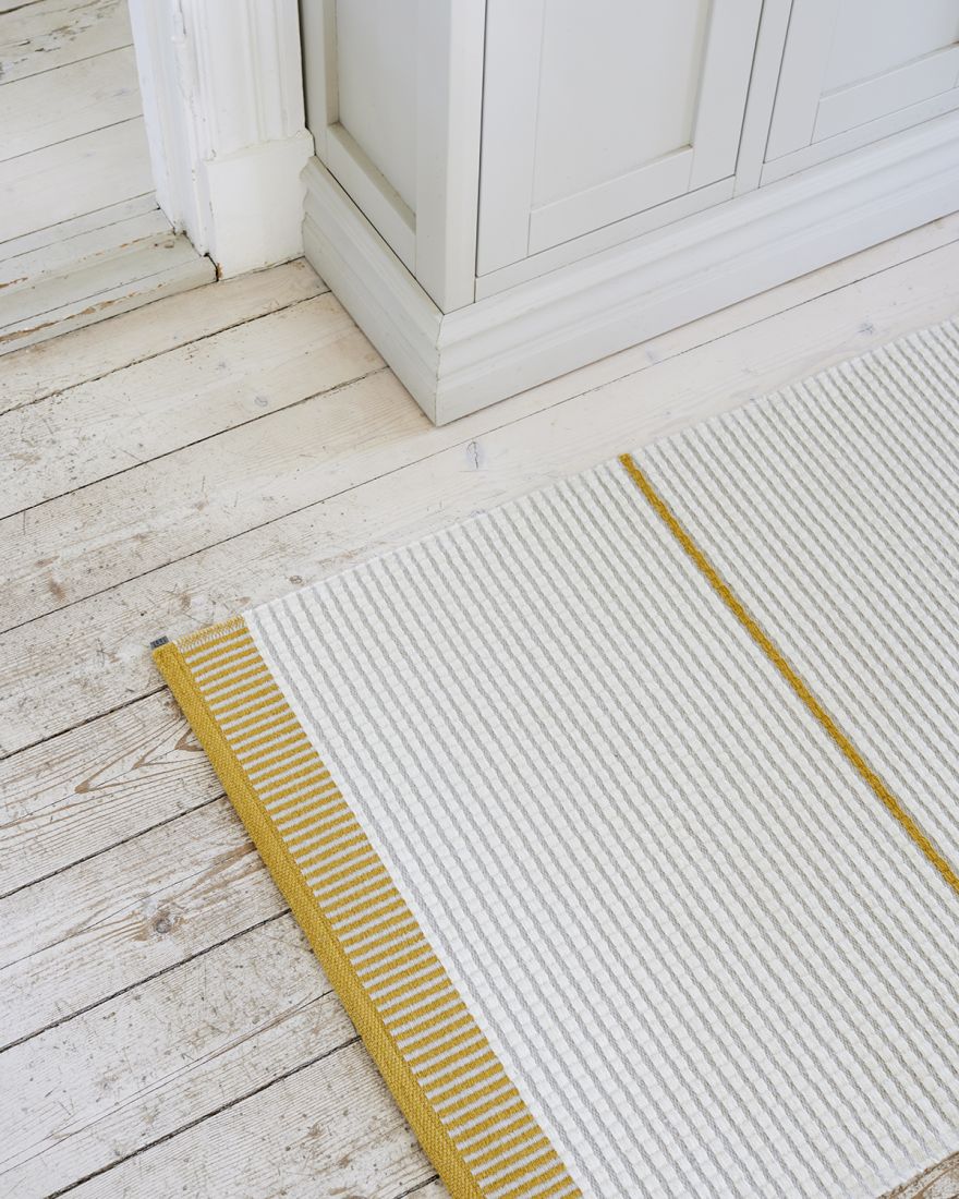 Solvik er et vævet uldtæppe fra svenske Horredsmattan. Tæppet er vævet i et stribet mønster af hvidt og gråt. Med jævne mellemrum dukker en markeret streg op i en lækker farve. Samme farve afslutter også de korte sider på en flot måde. Her ses Solvik i farven sennepsgul.