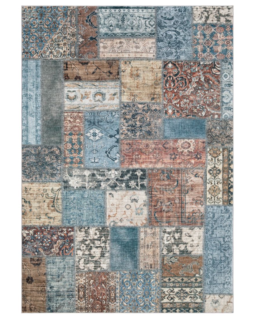Tarfaya er et maskinvævet tæppe med et trykt mønster, der ligner et patchworktæppe i mange forskellige farver og mønstre. Alle firkanterne er pænt samlet af en søm, også den trykte, og det skaber en følelse af vintage. Tæppets overside har en meget kort, men blød luv, og den skridsikre TPR-bagside betyder, at det ligger fast på gulvet. Tæppet er nemt at rengøre og kan desuden maskinvaskes. Her ses Tarfaya i varianten Patch multi.