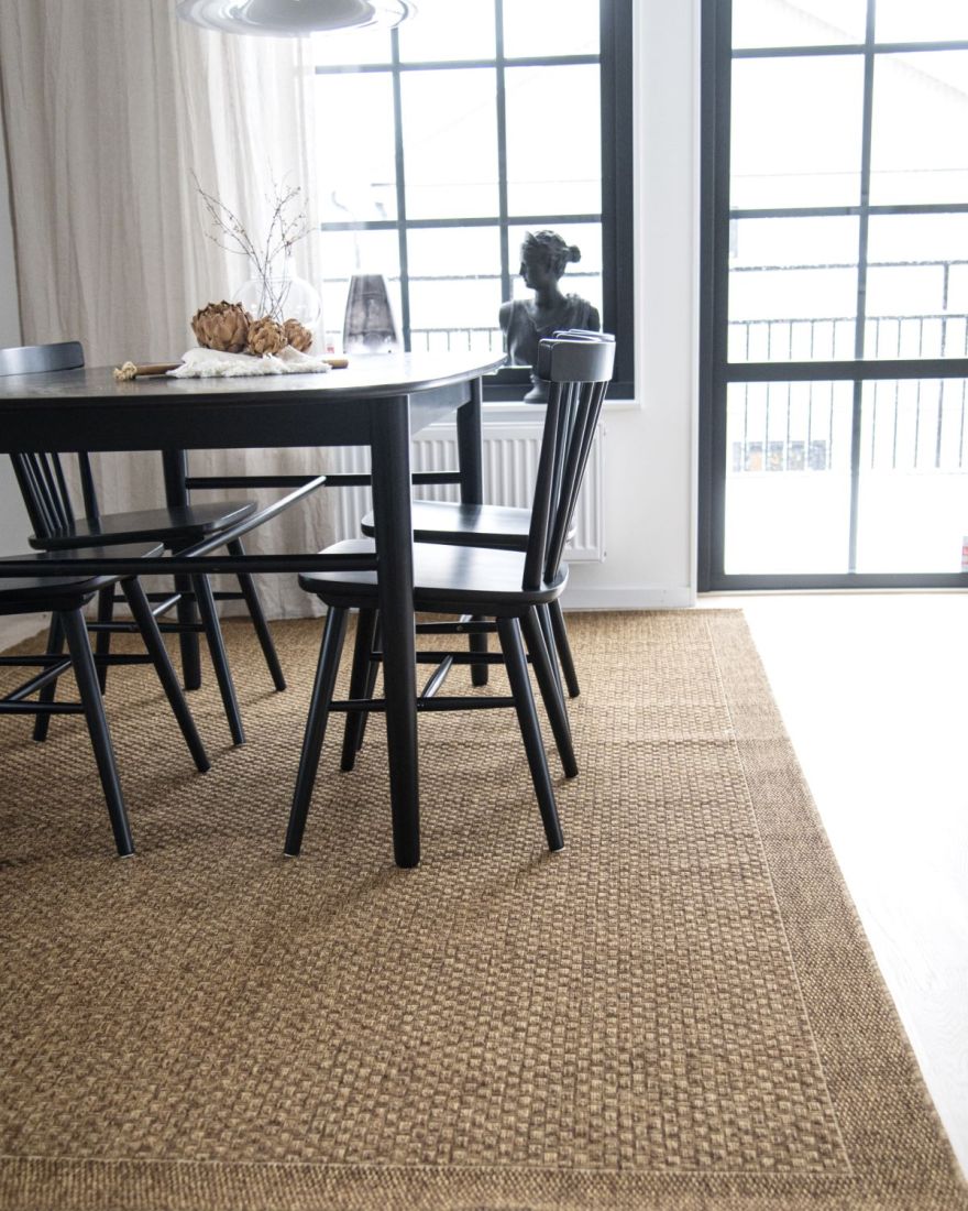 Valetta er et fladvævet tæppe med et tidløst og alsidigt design, perfekt til at pryde dit hjem både indendørs og som udendørstæppe. Tæppets plane overflade er præget af en lækkert vævet struktur i sisal-look med en omsluttende subtil kant. Med sine slidstærke egenskaber og UV-bestandige materialer er Valetta den perfekte indretningsdetalje til alle hjemmets rum. Den enkle rengøring gør også tæppet let at støvsuge, tørre af eller spule rent efter behov. Med Valetta kan du skabe en hyggelig atmosfære, både under spisebordet, i soveværelset og på terrassen. Her ser du Valetta i farven brun.