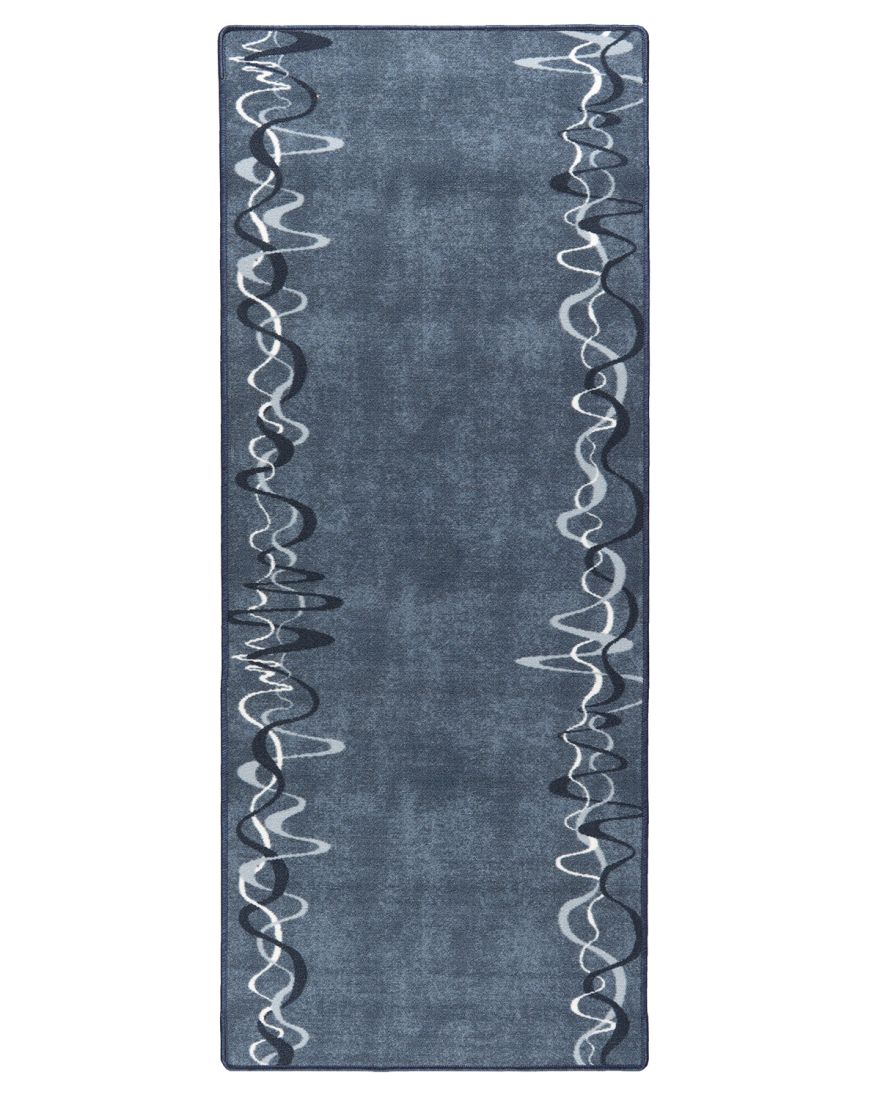 Tæppet Wave har en kort luv i små, tætte løkker og en gummieret bagside. Den korte luv gør at det er nemt at støvsuge og holde rent, og den gummierede bagside sikrer at det tæppet ligger stabilt på gulvet. Mønstret, som minder om havets bølger, følger tæppets langsider. Wave findes i flere forskellige farver. Her ser du det i farven blå.